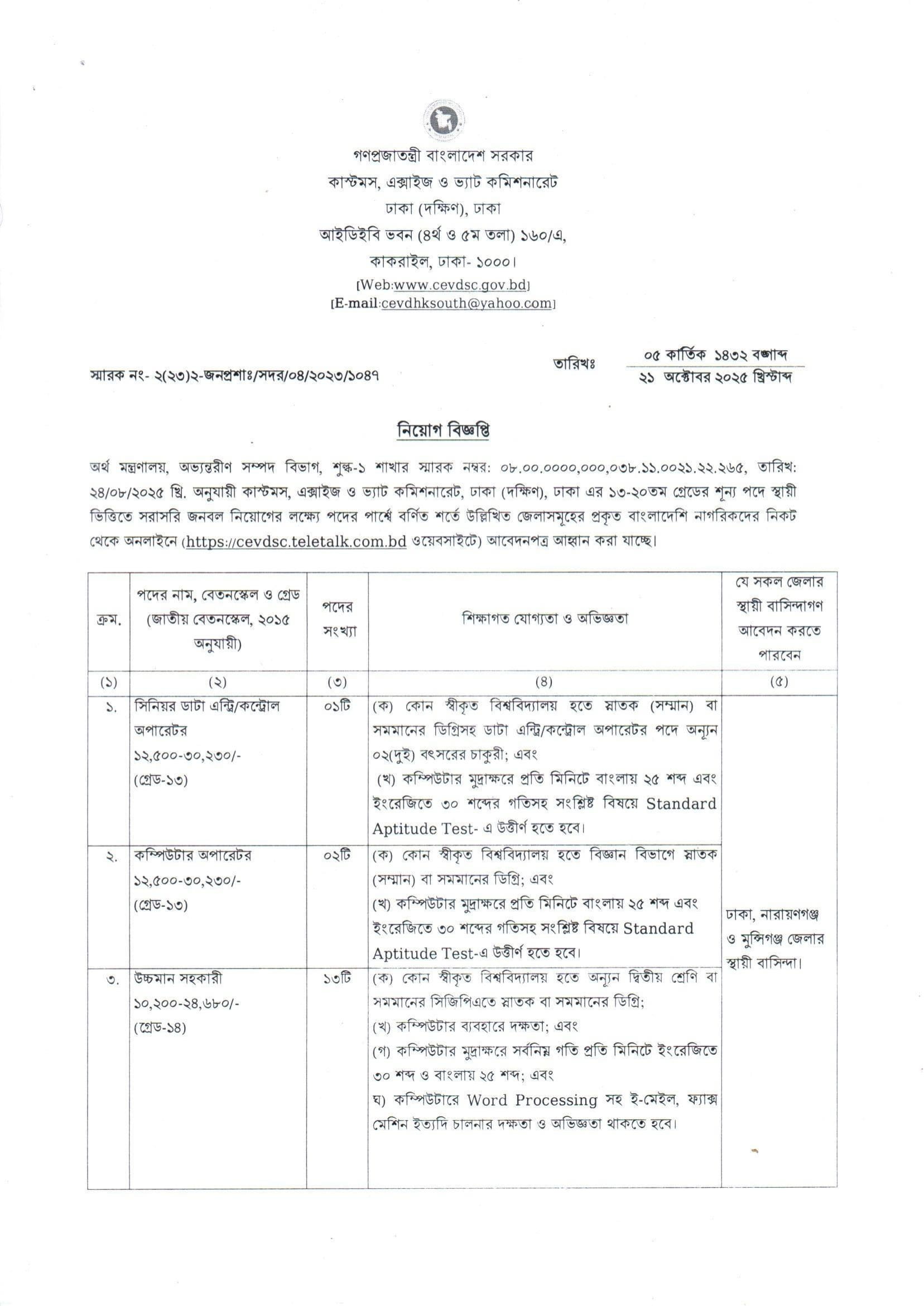 কাস্টমস, এক্সাইজ ও ভ্যাট কমিশনারেট ঢাকা (দক্ষিণ) নিয়োগ বিজ্ঞপ্তি ২০২৫
